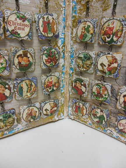 I used another piece of the same paper to make the page backgrounds for the frames. I glued the paper to more blue card, distressed the edges, added some crackle texture paste and some glitter and gold paint to the edges of the two pieces.  I cut out small Christmas images from some Graphic 45 paper and glued these to the front of the frames.  I assembled the frames using swivels and jump rings and then used split pins to attach them to the pages.  The idea of the swivels is so that the frames can be turned each day from the side with the pictures on to the side with the numbers.  Here is how the assembled pages look.